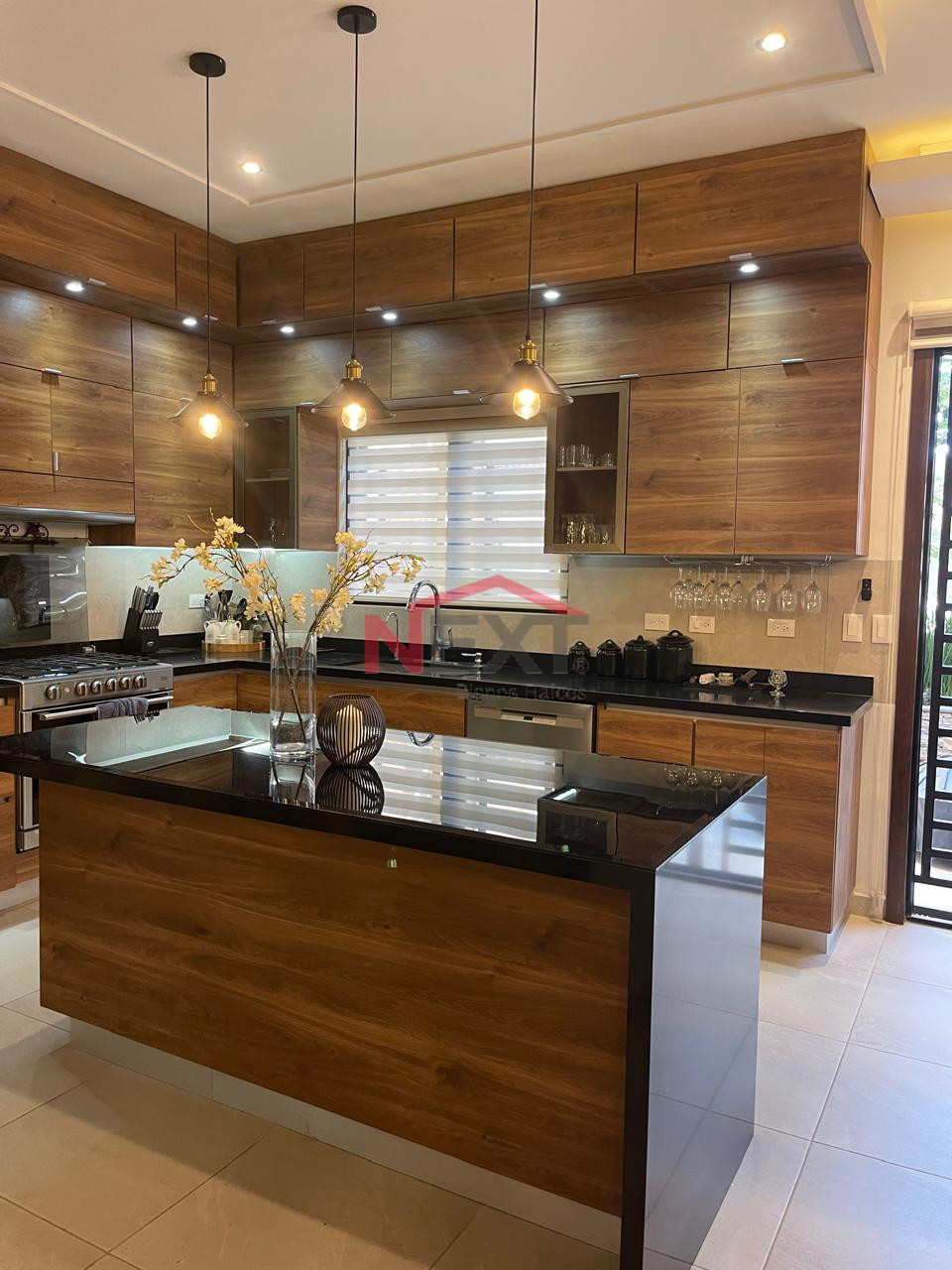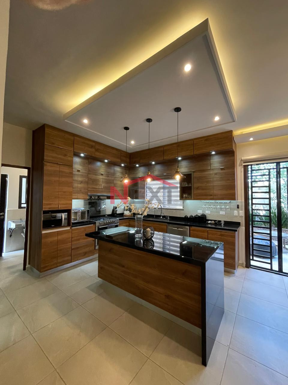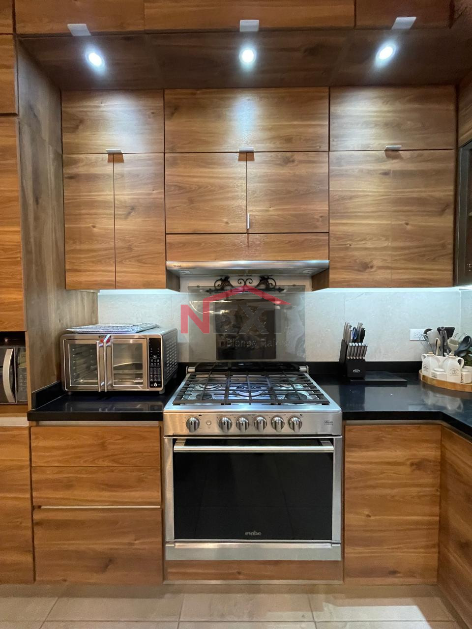 Cocina: horno, refrigerador, estufa, alacena (puertas de vidrio), lavajillas , campana, microondas, cubierta de cuarzo , tipo de madera ( carpinteria en toda la casa es nogal )